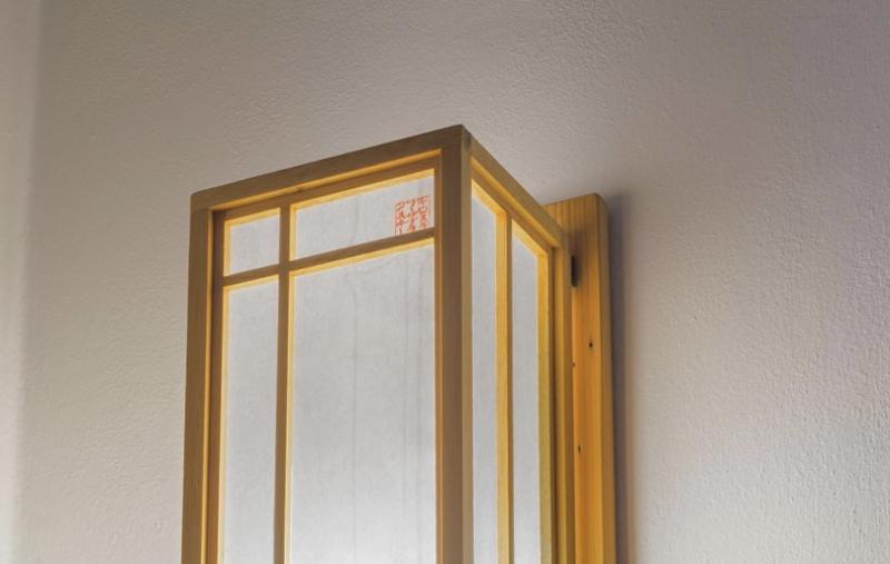 lehkost a eleganceRučně vyrobené svítidlo inspirované japonským uměním shoji a kumiko. Viditelný tag v katakaně - vínová barva.